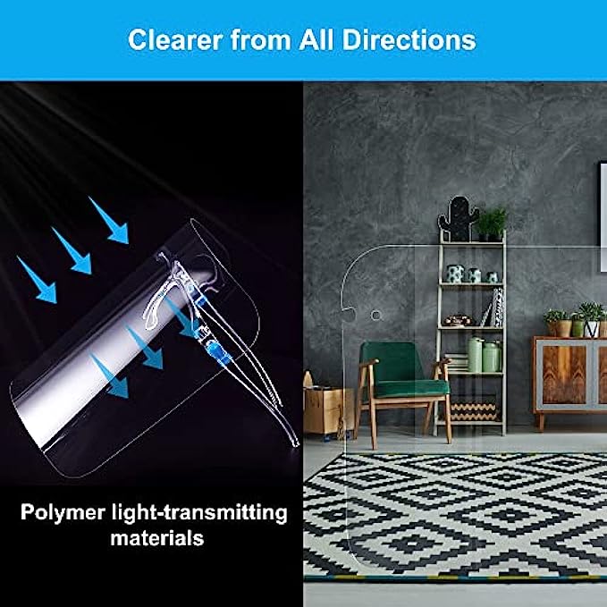 【10 PACK of face shield】Durable, lightweight, and comfortable protective face shields that are made with ultra-clear elastic and thick plastic. Each face shield contains an individual acrylic glasses frame, so you can get 10 complete Face shields with High quality glasses frames. When wearing glasses over your ears and on your nose bridge, this face shield protecting you will provide good protection as well as comfort. One size fits all and could be shared with families and friends.
