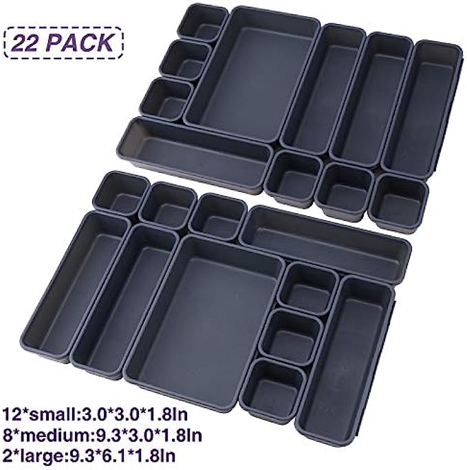 Customize Combination - 22 pack flexible small drawer organizer with 3 various sizes allow for a good variety of layout. Items are organized according to size and use. contains 12pcs Small:(2.9×2.9×1.8 inch) - 7.5×7.5×4.5 cm,8pcs Medium:(9×2.9×1.8 inch)- 23.5×7.5×4.5cm,2pcs Large:(9×6×1.8 inch)-23.5×15.5×4.5cm.