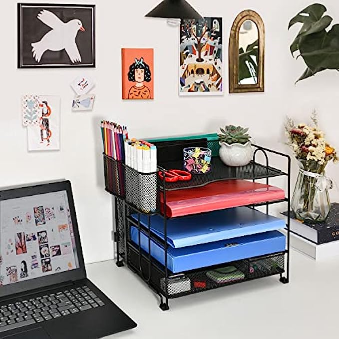 5 Tier Office Desk Organizer, Paper Letter Tray Organizer, Desktop File Organizer with Extra Drawer and 2 Pen Holders, Mesh Office Supplies Desk Organizer for Home Office