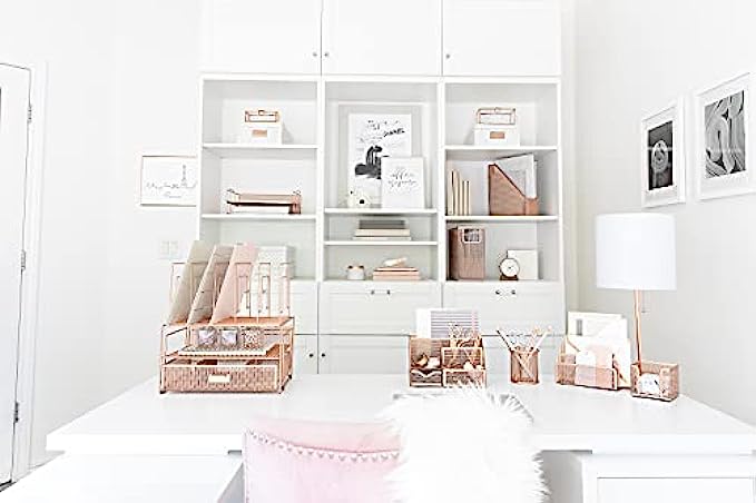 MODERN, SPACE SAVING DESIGN: Organization does not have to be difficult. Made of metal finished in rose gold and featuring a unique mesh design, this Vertical and Horizontal File and supplies organizer with drawer and letter sorter keeps things organized and saves space.