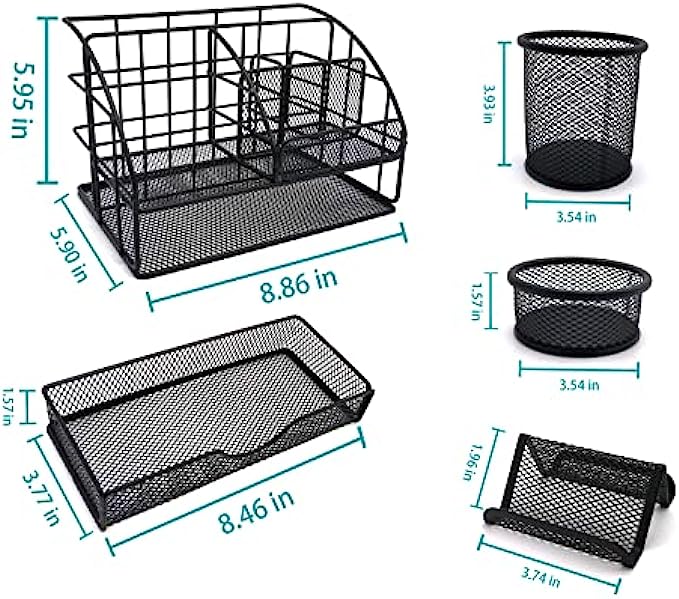 All-in-one Office Supplies Set: This Caicvanlo desk organizer has 7 compartments (1 vertical book/paper storage part +5 small parts + 1 large drawer) . It also comes with a pen/pencil holder, a paper clip holder, and a business card holder for office/home/school desk sorting and storage. Dimensions - desk organizer: 8.86 x 5.9 x 5.95 inches; pen Holder: 3.54 x 3.93 inches; paper Clip Holder: 3.54 x 1.57 inches; business card Holder: 3.74 x 1.96 inches