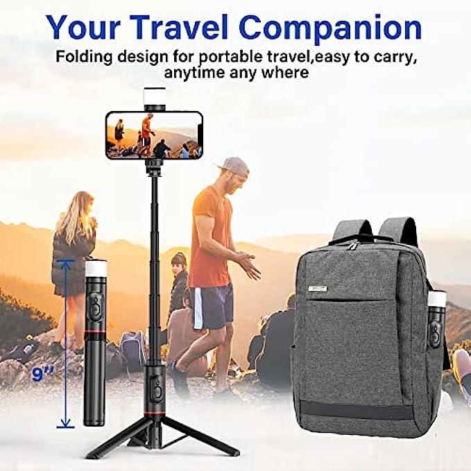 ?【Rechargeable And Rotatable LED Fill Light】This 2022 new-upgraded selfie stick tripod is equipped with a 360°Rotation LED Fill Light. 3 color temperature modes(white, natural, and warm) and each mode has 3 brightness levels, offering 9 options to help you take clear pictures in subdued lighting, then stand out. Perfect for selfies, vlogs, live streaming, group photos, etc.