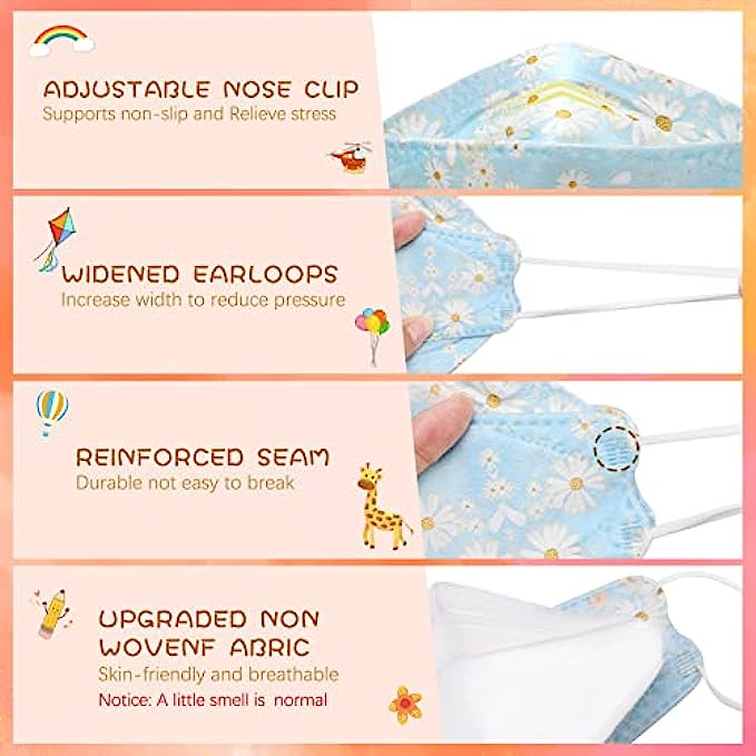 Ear Loop closure 【Exclusive Design】: The KF94 fish mouth design can form a perfect wrap from the chin to the bridge of the nose without leaving a gap. At the same time, it can prevent the mouth from contacting the mask, which increases the safety level and has the best wearing feeling. 【Product Introduction】: kids disposable face masks,The folding specification is :17*7CM, the unfolding is :17*15 CM, four layers of protection, can be close to the face, get the best protection effect, the ear hook is 6CM, the longest stretch is 18CM, and the elasticity is excellent. 【Four-layer Material】: the outermost layer is made of printed non-woven fabric, and the middle layer is made of two layers of melt-blown fabric, which can effectively prevent PM2.5 and protects up to 95%. The last layer is made of skin-friendly non-woven fabric, which fits the face without hurting the skin . 【Strong air Permeability】: Because the fish mouth shape design reserves a larger breathing space, a part of the air is reserved in the empty slot. This design will have better air permeability than ordinary masks and easier to breathe. Glasses will not be so Foggy. 【You Will Get】: 6 patterns, each 10 pieces individually packaged, a total of 6 packs (60 pieces)