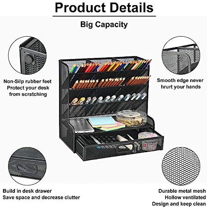 Marbrasse Mesh Desk Organizer, Multi-Functional Pen Holder, Pen Organizer for desk, Desktop Stationary Organizer, Storage Rack for School Home Office Art Supplies (Black Mesh Pen Holder with Drawer)