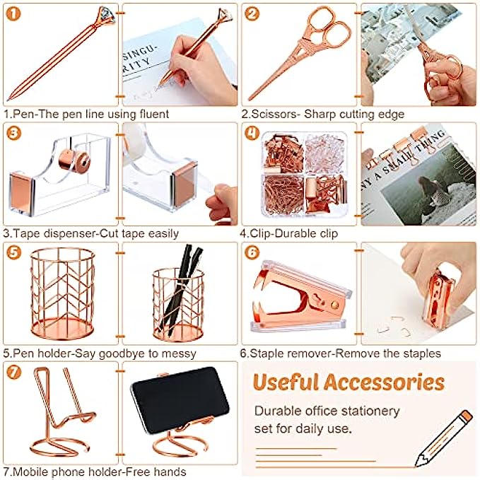 • Intimate Combination: you will receive 1 set of desk accessories, including 1 stapler, 1 tape holder, 1 staple remover, 1 pen holder, 1 box of staples, 1 mobile phone holder, 2 pens, 1 ruler, 1 scissors and 1 box of binder clips, sufficient to satisfy your diverse demands