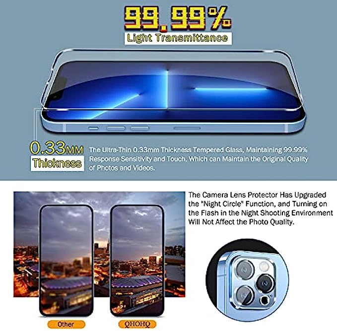 • AR Technology and Night Shooting Function: The camera lens protector are designed for iPhone 13 Pro Max 6.7", using augmented reality "Seamless" fusion new technology, with enhanced light transmission function, no need to design the flash hole position, even if the flash is turned on at night, it can be 99.99% guarantee the original quality of photos and videos.